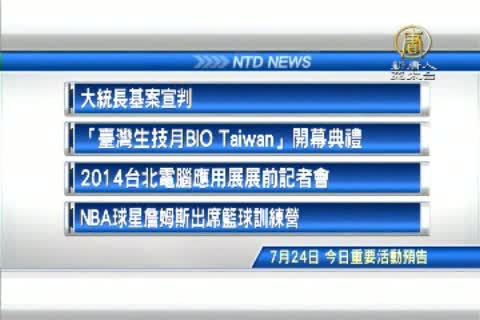【新唐人亞太台2014年7月24日訊】接著來看到,今天,七月24日,星期四,有哪些重要的活動,上午,大統長基案將宣判,副總統吳敦義出席「臺灣生技月BIO Taiwan」開幕典禮,2014台北電腦應用展展前記者,NBA球星詹姆斯出席高雄的籃球訓練營。