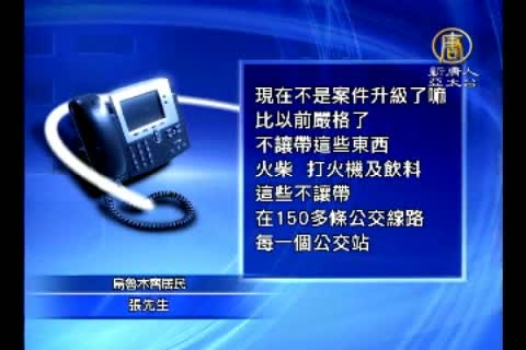 【新唐人亞太台2014年7月26日訊】繼大陸上海警犬、特警在各大公交站臨建之後,新疆當局也出新規,烏魯木齊市內的上百條公交線路,禁止乘客攜帶液體、打火機及不明粉狀物等,引起網友熱議,當地居民表示,中共當局的這種做法解決不了根本問題。