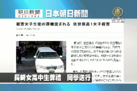 【新唐人亞太台2014年7月30日訊】來看到日本朝日新聞報導:長崎縣佐世保市一名高中女生遭同學殺害事件,29號,舉行女學生的葬禮。同學們都不捨地叫著她的名字,為她送行。