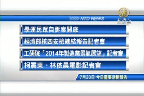 【新唐人亞太台2014年7月30日訊】接著來看到,今天,七月30日,有哪些重要的活動,太陽花學運後學生及民眾集體向法院自訴,行政院長江宜樺下午將出庭應訊。下午,經濟部將舉辦核四安檢總結報告記者會。財經訊息,工研院「2014年製造業景氣展望--第3季IEK- CQM」記者會,娛樂消息,柯震東、林依晨電影記者會。