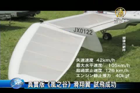 【新唐人亞太台2014年7月31日訊】宮崎駿的經典動畫作品《風之谷》是不少人的回憶,女主角娜烏西卡駕駛著滑翔翼,在天空翱翔,也讓不少動畫迷心生嚮往,日本一位大學教授,花費10年的時間,成功製作出真實版的「噴氣式滑翔翼」,日前真的試飛成功,駕駛員可以靠著重心控制方向,在天空滑翔。