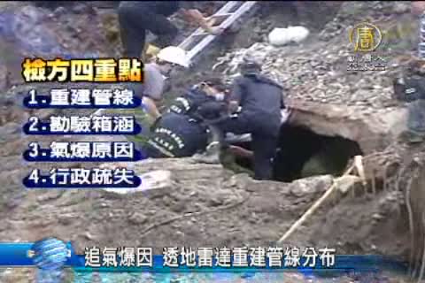 【新唐人亞太台2014年8月4日訊】高雄氣爆案罪魁禍首,目前嫌疑最大的雖然是李長榮化工,但檢方懷疑,不只一處氣體溢漏,將透過透地雷達等儀器,重建地下石化管路分布情形,查出氣爆真正原因;上午還有水利局出動「污水下水道檢視車」,以遙控攝影機查看污水管是否破損。