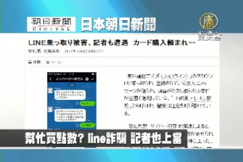 【新唐人亞太台2014年8月5日訊】來看到日本朝日新聞報導:幫忙買點數? line詐騙 記者也上當。利用line盜取帳號,佯裝朋友的詐騙訊息在日本全國急速增加。愛知縣警察調查,縣內在2個月內的詐騙損失總金額,已超過400億日圓。