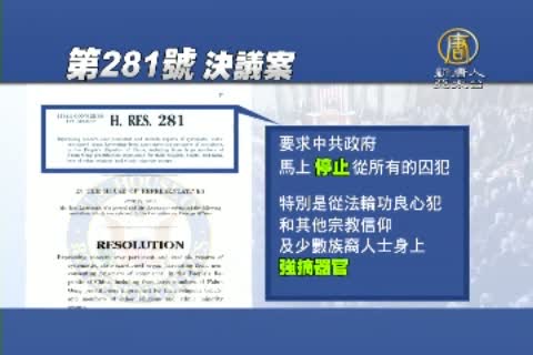 第281號決議案明確提出,「要求中共政府馬上停止從所有的囚犯、特別是從法輪功良心犯和其他宗教信仰及少數族裔人士身上強摘器官;要求美國國務院對中國的器官移植業(系統)進行全面和透明調查;要求中共立即停止其發起的已持續15年的對法輪功精神修煉的迫害,立即釋放所有法輪功修煉者和其他良心犯。」