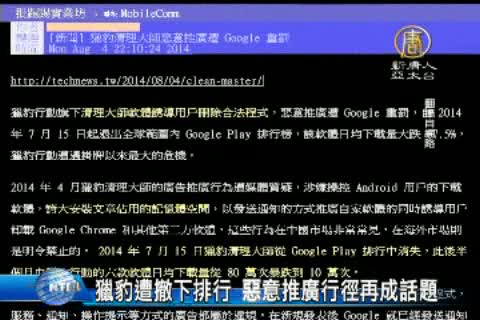 【新唐人亞太台2014年8月6日訊】不知道您有沒有這樣的經驗,在看中國網站,或使用相關手機APP時,發現會額外下載其他軟體,或是綁架首頁,造成使用困擾,近期,在Google平台上,號稱下載量第一名的,中國軟體獵豹,傳出因為違反Google條款,撤下軟體排行榜,再度成為話題。