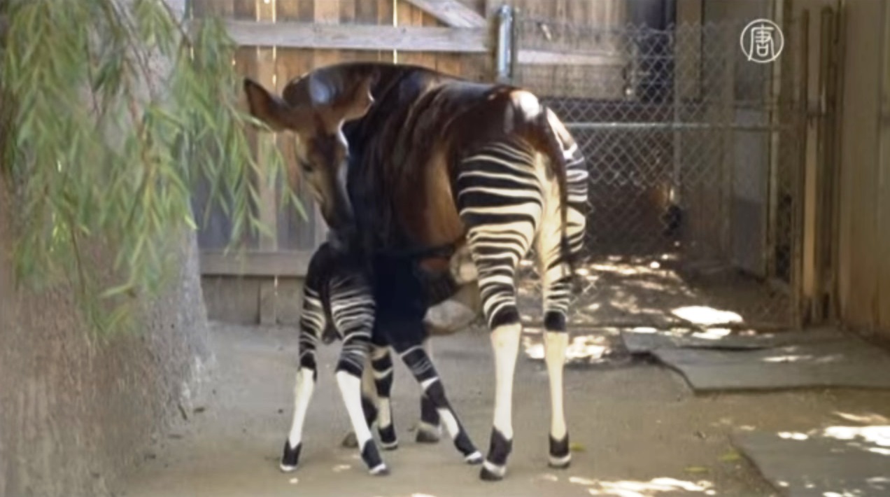 這隻霍加狓(Okapi)男寶寶 - 傑克遜(Jackson)是7月6日誕生的,最近才終於習慣用牠那瘦小的雙腿走路,現在他總是緊緊依偎在牠的媽媽阿亞納(Ayana)身旁,模仿著她的行為。