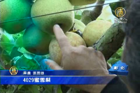 果農 張富雄:「今年才研發出來的,我這個可以研發出兩台斤,一顆兩台斤,這個一顆可以研發到四台斤。豐水梨,跟這是一樣豐水梨,這個是蜜雪梨,改良場說的是蜜雪梨,4029蜜雪梨,這也是蜜雪梨,這個沒有日光照射。」