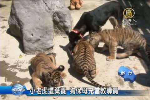 【新唐人亞太台2014年8月22日訊】新竹一間動物園裡,五月份誕生了四隻孟加拉小老虎,因為遭到老虎媽媽棄養,保育人員以人工奶瓶餵養,如今小老虎已經長得頭好壯壯,活力十足。動物園還特地安排一隻狗保母,讓小老虎學習模仿吃飯上廁所,幫助牠們順利回歸老虎家族。