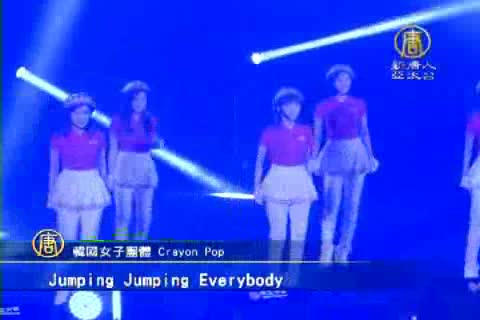 韓國女子團體 Crayon Pop:「Get Set Ready Go Jumping Jumping Everybody Jumping Jumping 一起 跑啊 跑啊 Jumping Jumping Everybody I don't want ro stick at home now」