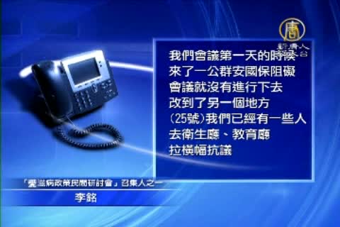 「愛滋病政策民間研討會」召集人之一 李銘:「我們會議第一天的時候,來了一群公安國保阻礙,會議就沒有進行下去,改到了另一個地方,(25號)我們已經有一些人去衛生廳、教育廳,拉橫幅抗議。」