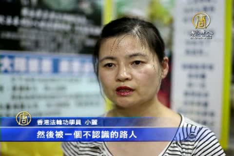 香港法輪功學員小麗:「第一次打到肚子左邊這裏,後面是用單張拍我的頭,然後拳打腳踢一直打,然後被一個不認識的路人,叫她停手,她才停手,一停手我就報警了。」