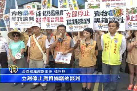 台聯組織部副主任 張兆林:「今天來到貨貿談判的現場,要表達台灣人民最強烈的要求,我們要求馬政府跟共產黨,立刻停止貨貿協議的談判,立刻停止這個禍害台灣貨貿協議的談判。」
