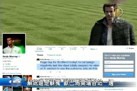 【新唐人亞太台2014年9月19日訊】就在蘇格蘭獨立公投啟動的當天,美國總統歐巴馬,和蘇格蘭籍的英國網球天王莫瑞,都在推特上發佈對公投的意見,不同的是,一個反對獨立,另一個支持。