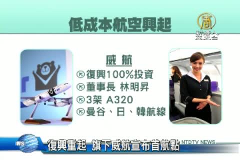 【新唐人亞太台2014年9月19日訊】財經消費來看到,由復興航空百分之百投資,台灣第一家本土低成本航空品牌,威航,禮拜四舉行了制服發表會,表示將會在年底以前正式開航,要和日本樂桃航空以及下禮拜營運的虎航,一較高下。