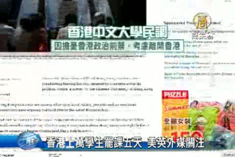 【新唐人亞太台2014年9月22日訊】香港學聯今日起發起一連五天的學生罷課運動,抗議中共對香港普選特首訂下的限制,許多美英外媒也跟進報導,甚至認為這次的民主意義,相當於25年前的天安門絕食抗爭。