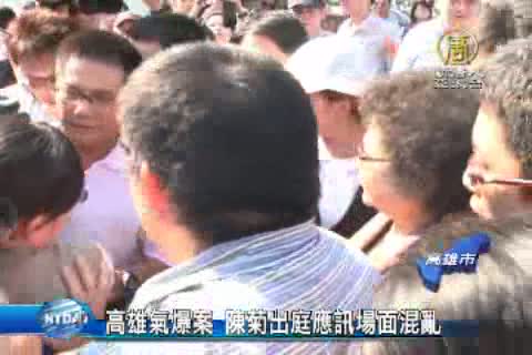 【新唐人亞太台2014年9月25日訊】高雄地檢署偵辦高雄氣爆案,市長陳菊今天(25日)下午出庭應訊,現場湧入議員候選人與支持民眾三、四百人到場聲援,場面一度相當混亂。檢方認為氣爆案導致30多人死亡、3百多人受傷,有必要請市長陳菊、副市長劉世芳等4人到案說明,加上議長許崑源提告指控高雄市府官員涉嫌瀆職罪,陳菊等人也成了「他」案被告。