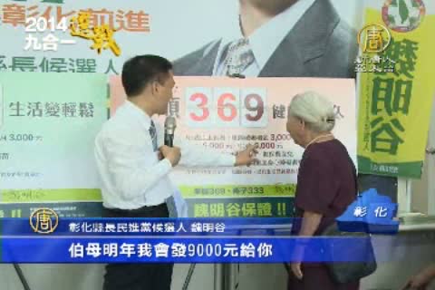 彰化縣長民進黨候選人 魏明谷:「65歲以上敬老津貼,3000元,80歲6000元,90歲9000元,伯母明年我會發9000元給你,你超過90歲了。」