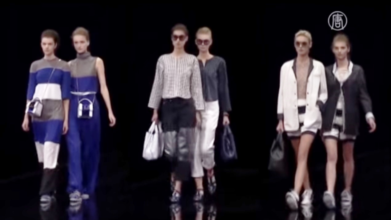 【新唐人亞太台 2014 年 09 月 27 日訊】2015春夏米蘭時裝週重量級品牌陸續登場,喬治•亞曼尼 (Giorgio Armani) 發布系列女裝,以沙灘多變的色彩為主色調,展現出女性溫柔、細膩、浪漫、飄逸又不失典雅的高貴氣息。而副品牌的安普里奥•亞曼尼 (Emporio Armani) 2015春夏女裝,則以矢車菊藍及天藍色為主色調,壓軸好戲是三套藍色PVC材質、露臂短裙的小禮服。