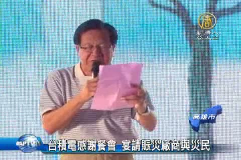 【新唐人亞太台2014年9月28日訊】台積電27日在高雄三信家商席開80桌,宴請參與高雄氣爆重建的協力廠商以及災民代表,台積電志工社社長張淑芬說,第一個要感謝董事長同意救災金額無上限,第二個是感謝互助廠商的參與。