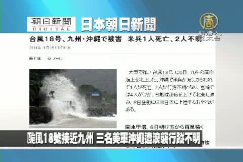 【新唐人亞太台2014年10月6日訊】來看到日本朝日新聞報導:颱風18號接近九州 三名美軍沖繩遭浪襲行蹤不明。