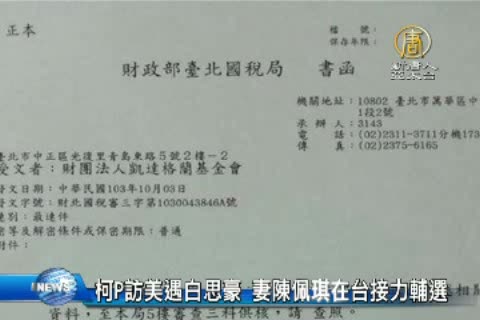 【新唐人亞太台2014年10月10日訊】無黨籍台北市長參選人柯文哲出訪美國,受到台灣僑胞熱烈支持,今天到紐約市議會還巧遇現任市長白思豪。而柯文哲的太太陳佩琪也在台灣柯文哲總部演講,為柯文哲輔選。陳佩琪也再次澄清沒有逃稅。