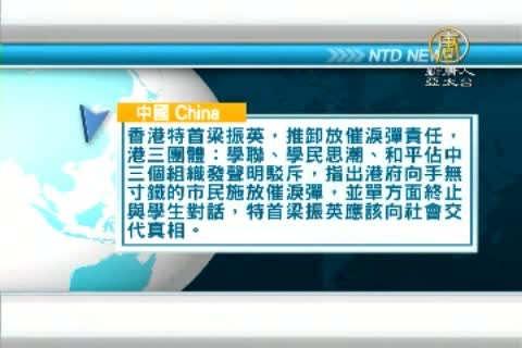 香港特首梁振英,推卸放催淚彈責任,港三團體:學聯、學民思潮、和平佔中三個組織發聲明駁斥,指出港府向手無寸鐵的市民施放催淚彈,並單方面終止與學生對話,特首梁振英應該向社會交代真相。