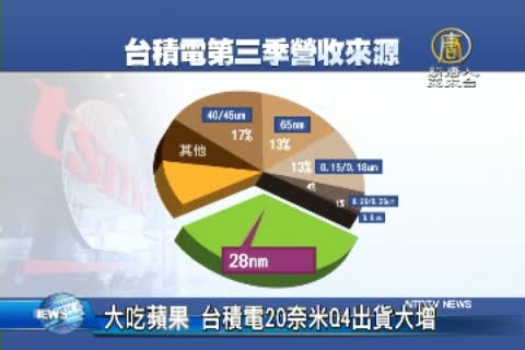 【新唐人亞太台2014年10月16日訊】財經訊息來看到,台灣晶圓大廠又傳出好消息,受惠於蘋果的強勁需求,台積電第三季營收大幅提升,同時透露明年除了要以16奈米為發展主力外,也預計在2015年試產10奈米製成,回應對手三星和INTEL。