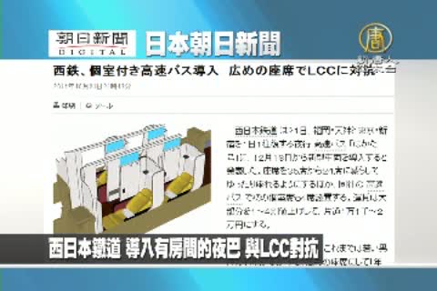 【新唐人亞太台2014年10月22日訊】來看到日本朝日新聞報導:西日本鐵道公司21日發表新型夜行巴士。首次提供有私人空間的座位,車票約貴1到4成。希望從削價競爭的廉價航空業中,保住客源。
