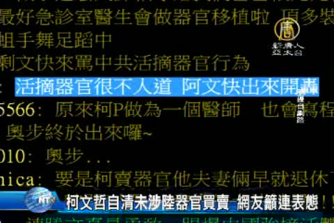 【新唐人亞太台2014年10月28日訊】由於中國器官移植大會,這個星期三,即將在杭州召開,對於大屠殺一書提及的內容,柯文哲辦公室昨天在臉書貼出聲明,澄清被指涉入中國器官買賣一事,消息立刻引發網友熱議廣傳。