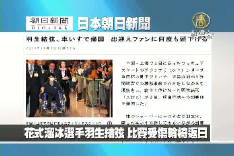 【新唐人亞太台2014年11月10日訊】來看到日本朝日新聞報導:花式溜冰選手羽生結弦,比賽受傷輪椅返日。8號在上海的世界花式溜冰錦標賽,羽生結弦,在比賽開始前不幸摔倒撞到頭部流血。但他仍堅持參賽,最後獲得銀獎。