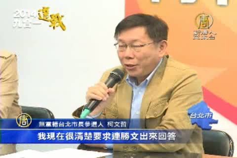 【新唐人亞太台2014年11月11日訊】關心台北市長選戰。國民黨市長參選人連勝文,要求柯文哲公布媒體業配經費,對此,柯文哲表示沒有花錢買業配,同時也要求連勝文公開業配金額。