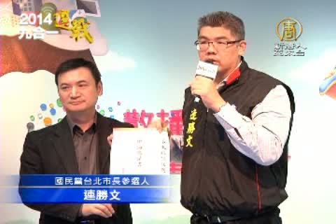【新唐人亞太台2014年11月13日訊】鏡頭轉回台灣,離九合一選戰只剩16天,國民黨台北市長參選人連勝文,今天(13日)向柯文哲下戰帖,邀請柯文哲一對一,辯論中韓FTA財經議題。