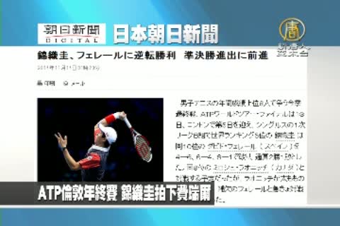 【新唐人亞太台2014年11月14日訊】來看到日本朝日新聞報導:ATP倫敦年終賽 錦織圭拍下費瑞爾。 13日在倫敦進行的ATP年終大賽,在男子B組比賽中,日本選手錦織圭擊敗費瑞爾,有望晉級準決賽