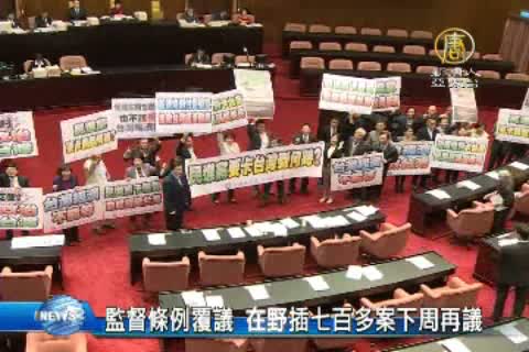 【新唐人亞太台2014年11月14日訊】立法院院會排定,處理兩岸協議監督條例覆議案,各黨團發出甲級動員,12點左右進入表決,國民黨舉牌,抗議民進黨卡關,而民進黨加台聯提出七百多項變更議程,一陣議事攻防後,立法院散會下禮拜再議,這是剛剛從立法院傳回來的最新畫面。