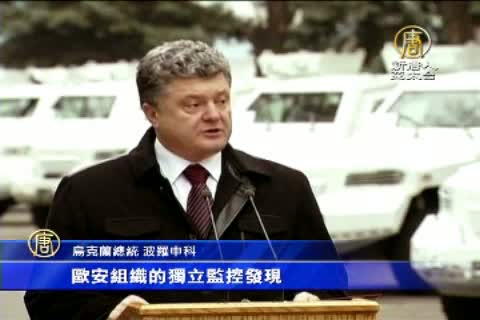 烏克蘭總統波羅申科:「歐安組織的獨立監控發現,俄羅斯正規部隊不斷來回烏俄邊境。在過去的幾天,有明確證據顯示,歐安組織的無人機,在非烏克蘭軍隊控制地區,遭到反叛分子的炮擊。」