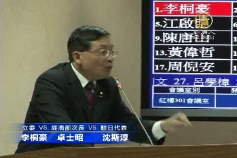 立委李桐豪 V.S.經濟部次長 卓士昭 V.S. 駐日代表 沈思淳 :「兩位請問,我們跟日本什麼時候可以簽定EPA?簽定FTA或EPA對雙方都是有利的,那麼現階段我們採用的作法是堆積木的方式,我剛剛講過積木要堆幾層嘛,你現在第幾層?我們現在已經簽了14個協議了,大概幾層?這將來整個的EPA會包含多少個章節,現在還沒有確定。那麼等到確定之後,就會知道說。我已經把時間表講出來了,中國大陸今天要跟澳洲簽FTA,這個也是RCEP的一個基礎,所以這才是真正堆積木啊。我們現在連FTA的積木還看不到咧,我們還在堆底層,所以我想請問兩位,我們政府有有沒有訂一個目標,什麼時候跟日本簽EPA,有或沒有。不能等到2020年或2030年吧。」