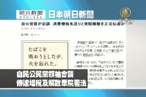 【新唐人亞太台2014年11月18日訊】來看到日本朝日新聞報導:自民公民黨領袖會談,傳達增稅及解散眾院看法。