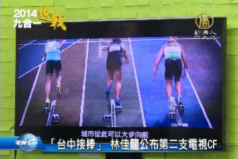 【新唐人亞太台2014年11月18日訊】台中市長參選人林佳龍今天公布第二支全國電視CF「台中接棒」,並找來台中體大專業的接力賽國手入鏡拍攝,用接力賽傳達出年底選舉的意義;CF訴求城市不是一個人的馬拉松,而是眾人合作的接力賽,記者會並找來田徑國手紀政擔任特別來賓。