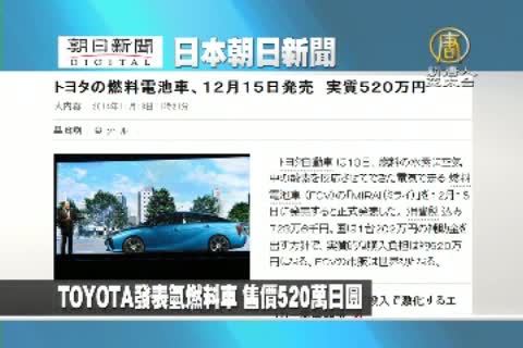 【新唐人亞太台2014年11月19日訊】來看到日本朝日新聞報導: TOYOTA發表氫燃料車,售價520萬日圓。這也是世界上第一輛氫燃料車。