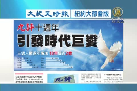 再來看到大紀元時報紐約大都會版報導:九評十週年,引發時代巨變。三退人數逐年增加,十年接近2億。