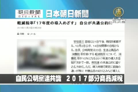 【新唐人亞太台2014年11月21日訊】來看到日本朝日新聞報導:自民公明黨達共識 2017部分商品減稅。 不過針對開始時期,兩黨看法仍有差距。
