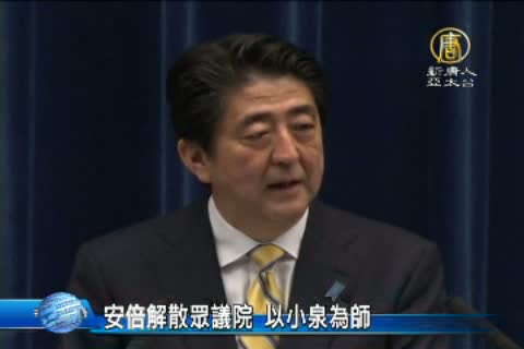 【新唐人亞太台2014年11月22日訊】這週的亞洲財經新聞焦點,莫過於就是:日本首相安倍晉三宣布解散國會了,目前,各政黨,也開始正式投入選戰。日本首相安倍晉三強調,安倍經濟學到底是對是錯,要將施政的成果交給選民來評分。日本媒體日經新聞則是報導,安倍可能想仿效前首相小泉純一郎在2005年為郵政民營化而解散國會,最後得勝鞏固政權。