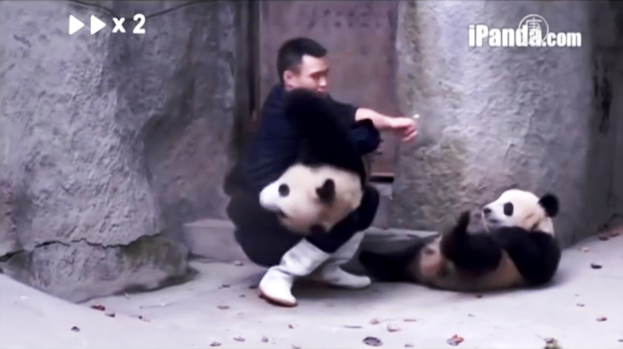 小貓熊聯手不吃藥 和飼養員玩摔角