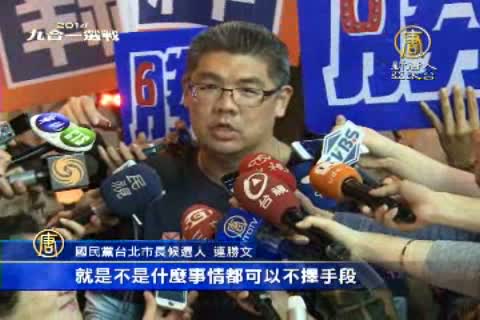 國民黨台北市長候選人 連勝文:「這個選舉的詐術,我們以前遇到很多次了,我想我們希望還是要給台灣社會一個訊息,就是不是什麼事情都可以不擇手段。」