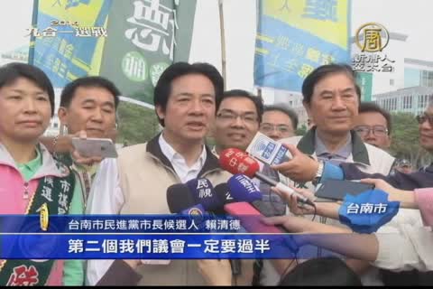 【新唐人亞太台2014年11月29日訊】選戰之夜,台南市長賴清德堅持不辦造勢晚會,他今天與台南老縣長立委陳唐山,分別率領山海線各區候選人以車隊拜票,進行廣場大會師,而國民黨市長候選人黃秀霜,依然請出總統牌,幫忙造勢。