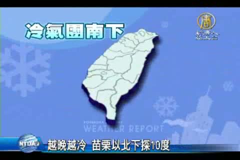 【新唐人亞太台2014年12月4日訊】今年入冬首波強烈大陸冷氣團今天報到,氣象局警告,今天晚上到明天清晨將是最冷的時段,苗栗以北,甚至可能下降到10度低溫。