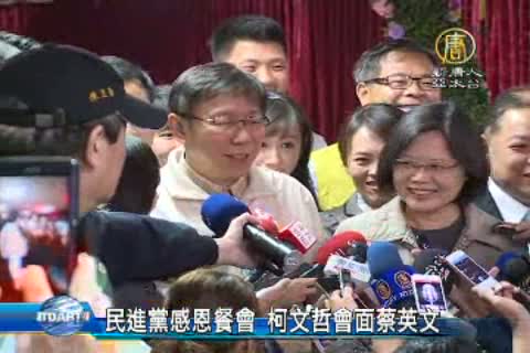 【新唐人亞太台2014年12月5日訊】民進黨感恩餐會,台北市長當選人柯文哲,在選後首度與民進黨主席蔡英文公開會面,連線到現場記者黃庭鋒,告訴我們最新情況,庭鋒。