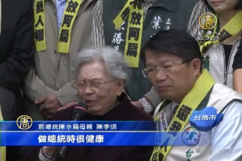 前總統陳水扁母親 陳李慎:「被關到不成人形,我去看他非常傷心,看起來很可憐,我一個兒子這樣,做總統時很健康,關了六年多,可以放出來,讓我們母子團圓。」