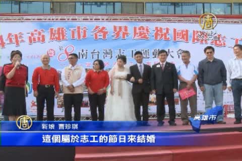 【新唐人亞太台2014年12月9日訊】慶祝國際志工日,日前(6日)在高雄中正運動場舉辦一場南台灣志工運動會,邀請氣勢磅礡的天國樂團開場,同時也感謝5,000多位老少志工的付出,副市長李永得到場,還為兩位志工新人見證終身大事。
