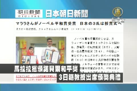 【新唐人亞太台2014年12月11日訊】來看到日本朝日新聞報導:馬拉拉獲頒諾貝爾和平獎 3日籍教授出席頒獎典禮。諾貝爾獎頒獎典禮10號在斯德哥爾摩開幕。三名獲得物理獎的日本教授前往領獎。